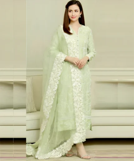 3PC Dhanak Chikankari Embroidered With Digital Printed Organza Dupatta-120