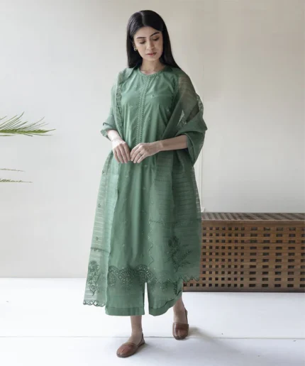 Linen 3PC Embroidered with Organza Sequins Embroidered Dupatta-13